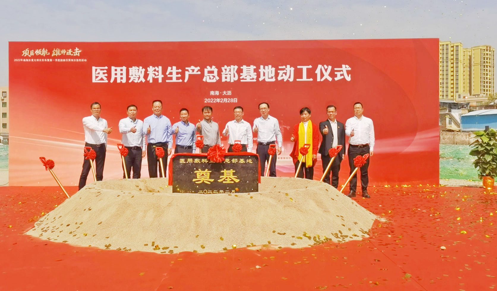 锣鼓阵阵,彩旗飘扬。2022年2月28日,优特医疗医用敷料生产总部基地奠基开工仪式在佛山南海区大沥镇隆重举行。占地33.58亩,投资2.3亿的新项目声势浩大地拉开了帷幕。